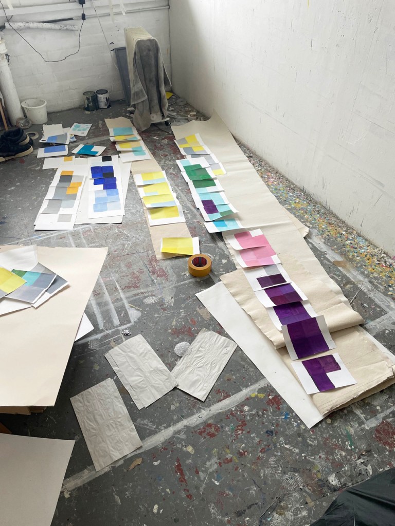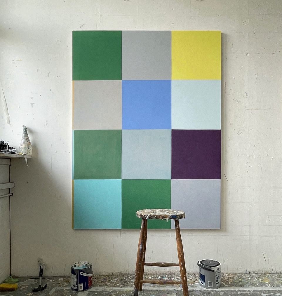 Mi piace soprattutto il processo di creazione, l’impegno fisico con i materiali. Il colore è diventato centrale nel mio lavoro e uno spazio importante per me è il mio banco di missaggio/scaffale di fronte alla finestra. Qui ho anche la mia radio e si potrebbe definire il mio luogo felice, ma in realtà è anche un luogo piuttosto impegnativo. La miscelazione del colore è per me un processo sia esplorativo che tecnico, che va dalla reazione o dalla sensazione alla pianificazione, alla realizzazione di colori specifici. Uso acrilici che si asciugano rapidamente, ma sono in grado di mantenere i colori attivi sigillandoli in vasi. Considero il colore come un elemento vivo o che dà vita all’opera, sia dal punto di vista materiale che per gli effetti visivi che crea. Di recente ho iniziato a pensare che anche un dipinto debba essere un essere vivente. In realtà è una cosa che qualcuno ha detto in un cortometraggio che ho visto parlando della serie di Joseph Albers Homage to the Square, è un bel pensiero e forse una buona misura per un’opera la domanda “è viva?”. Solo di recente ho iniziato a vedere la pittura in questo modo,