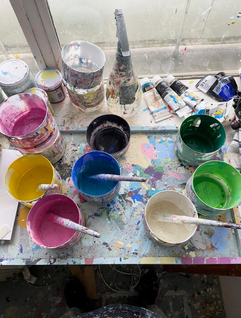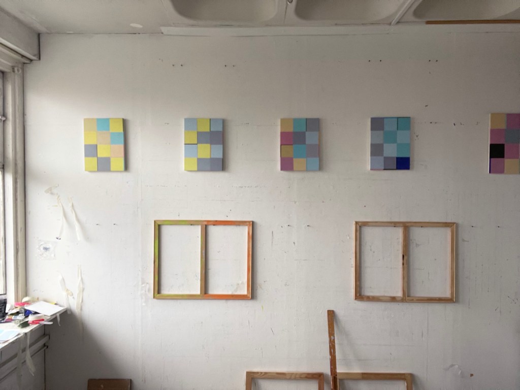 Mostly I enjoy the process of making, the physical engagement with materials. Colour has become central to my work and an important space for me is my mixing desk/ shelf in front of the window. Here I have my radio also and you could call this my happy place, but in truth it is also quite a challenging place aswell. The mixing of colour is both an exploratory and technical process for me, from responding or feeling my way to planning and making specific colours, I use acrylics which dry quickly but I am able to keep colours active by sealing them in pots. I see the colour as a living thing or the thing that brings the work to life, both materially and the visual effects it creates. Recently I began considering that a painting should be a living thing also. It was actually something someone said in a short film I saw talking about Joseph Albers Homage to the Square series, it’s a nice thought, and maybe a good measure for a work the question ’ is it alive?’ I only recently started to see painting that way, through using colour.
