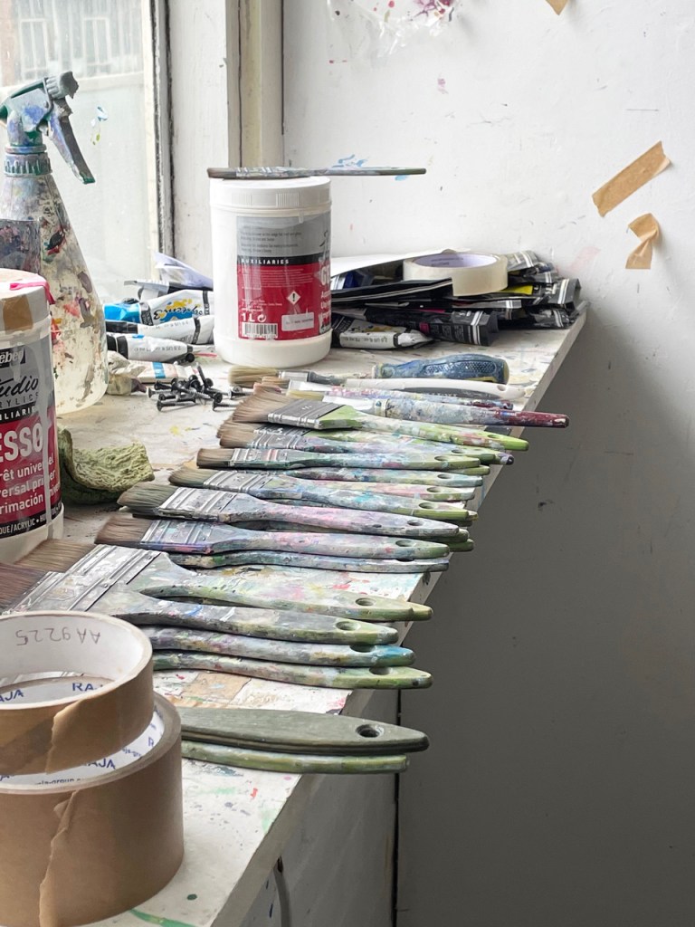 Ho accumulato abbastanza strumenti per sostenere la mia pratica attuale. Sembra tutto a posto? Cosa potrebbe andare storto, vi chiederete? Un pericolo è il nastro adesivo scartato che mi si attacca ai piedi, un fastidio costante ma non troppo grave nello schema delle cose. In generale, come ho detto, è un posto felice. Il lavoro va a cicli, da piccolo a grande, da grande a piccolo, da barella a barella e così via. Questi cicli possono essere annuali o biennali, ma ciò può dipendere anche dalle mostre. Ho una parete preferita per dipingere, che sfrutta la luce del giorno a nord e che uso per realizzare tutti i miei lavori, estendendoli al pavimento se necessario.