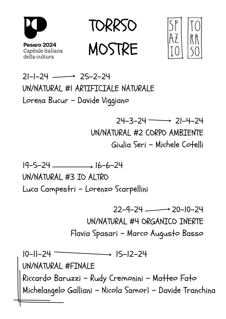 M.C.: L’attività è iniziata da pochi mesi, l’inaugurazione è avvenuta 16 giugno 2023 con la personale di Mika Palonen, artista finlandese che ho ospitato per una settimana di residenza alla fine della quale ha realizzato l’installazione pittorica. Dopo la personale di Carlotta Amanzi dello scorso dicembre il 2024 si è aperto nella straordinaria cornice di Pesaro Capitale Italiana della Cultura dove TORRSO ha inserito nel calendario un articolato progetto che si sviluppa nel corso dell’anno in 5 mostre e un festival che affrontano il concept UN/NATURAL. Quanto la natura è un oggetto culturale su cui si è proiettato nei secoli lo specchio del pensiero della propria epoca? Cosa è questo binomio natura/cultura ai tempi dell’antropocene e della rivoluzione informatica? Da questa posizione decentrata dell’uomo si sonderanno quali sono i confini tra corpo e ambiente, io e altro, organico inerte e artificiale naturale; alla conclusione di ogni mostra ci sarà un momento musicale e performativo per scandire i 5 capitoli del progetto. Il Festival UN/NATURAL US invece si terrà dal 20 al 27 luglio e sarà una riflessione sulla prima persona plurale attraverso proiezioni, concerti, mostre e dibattiti che verificheranno se è ancora percorribile la strada del Noi.
