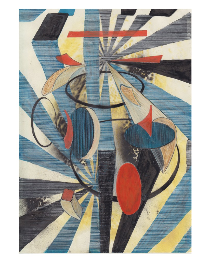 Pencil, ink, gouache, colored pencil and spray paint on paper