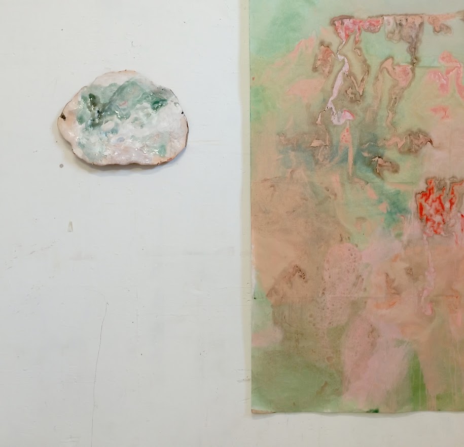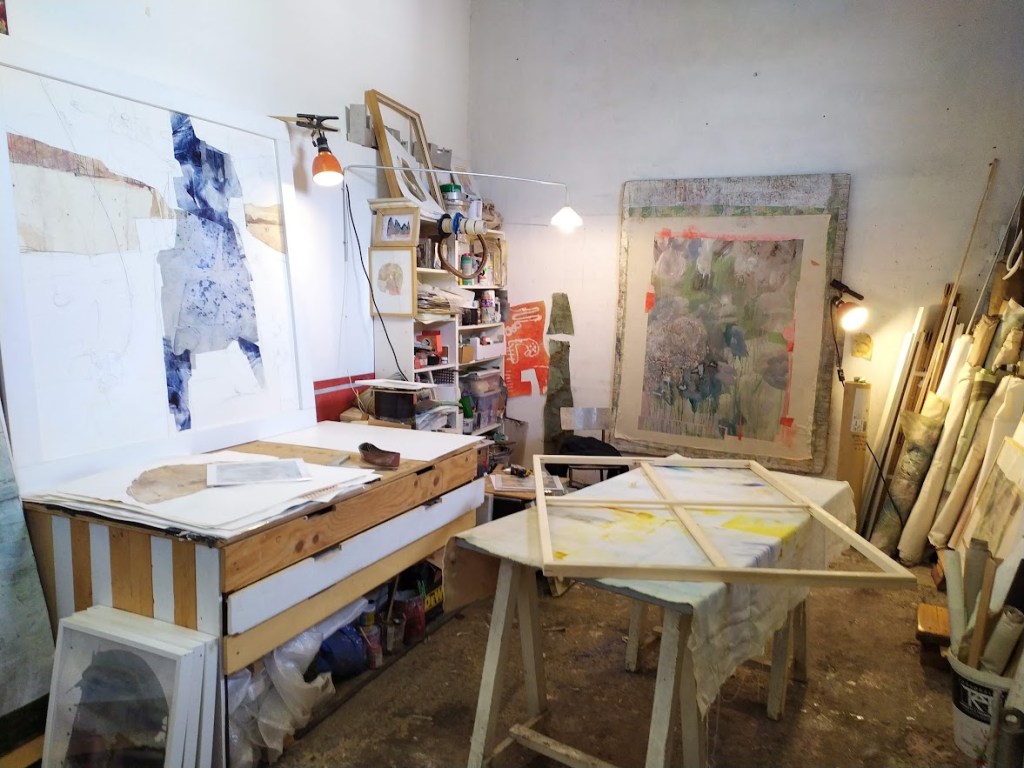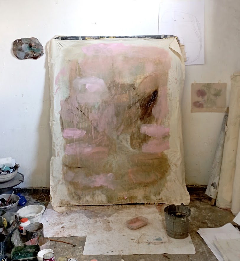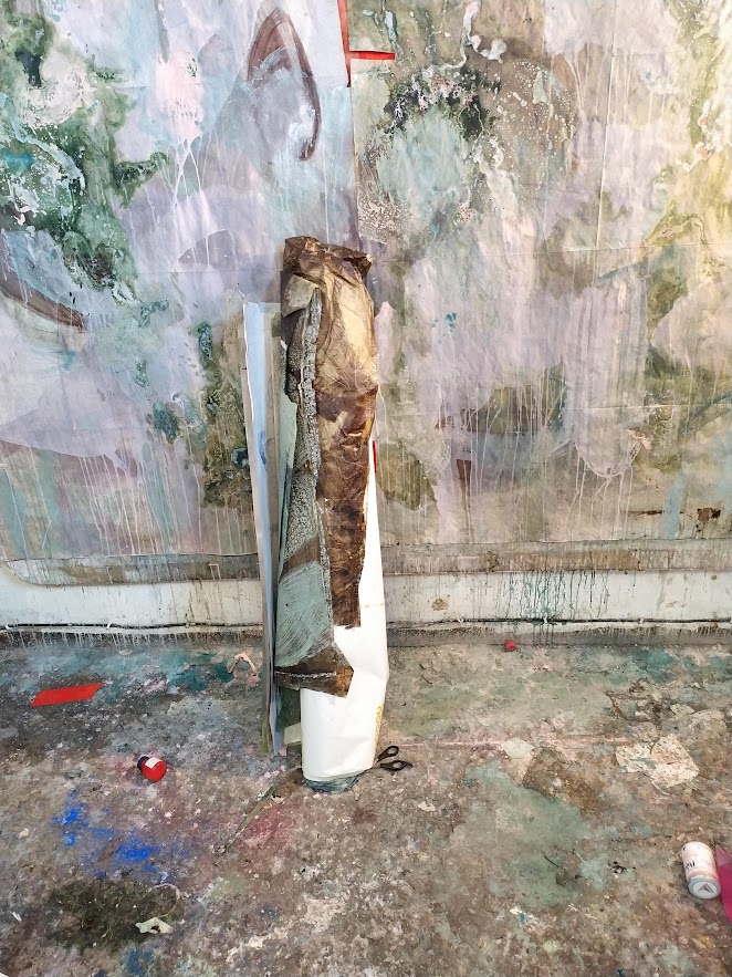 When I enter the studio, the first thing I do is turn on the lights and look carefully at the painting I left on the wall or on the floor the day before. After arranging the materials and the space I go back to my papers and resume the project I left behind, at other times I need to keep the work on hold for some time.