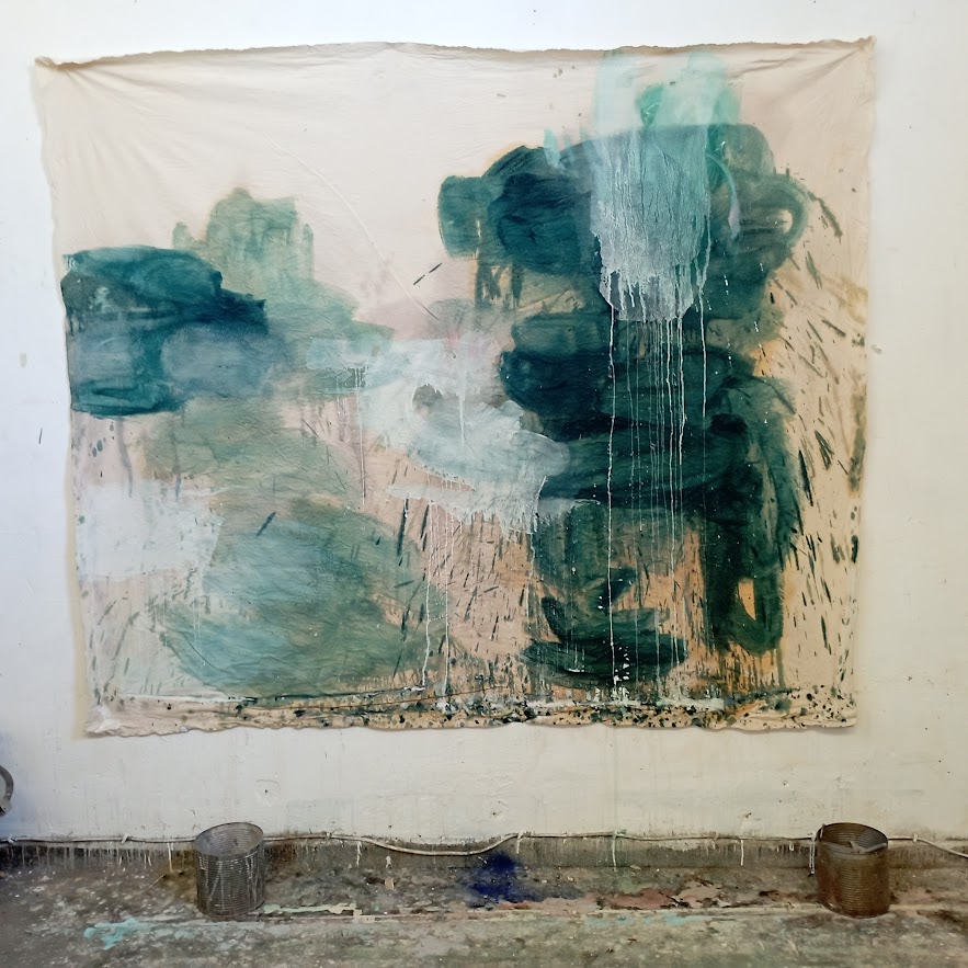 Quando entro a studio, la prima cosa che faccio è accendere le luci e guardare con attenzione il dipinto che ho lasciato sulla parete o a terra il giorno prima. Dopo aver sistemato i materiali e lo spazio torno sulle mie carte e riprendo il progetto lasciato, altre volte ho invece bisogno di tenere il lavoro in sospeso per qualche tempo.