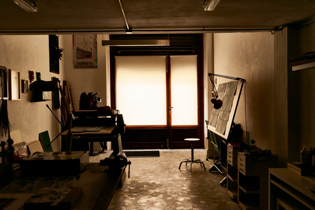 Interrogatomi sul da farsi, decisi di cominciare la mia ricerca nei dintorni di casa e, dopo svariati sopralluoghi, entrai per la prima volta in quello che, di lì a poco, sarebbe diventato il mio studio. Rimasi incredulo. Era un grande magazzino suddiviso in più stanze, abbandonato da decenni in pieno centro città. Penso di non aver mai preso una decisone così fulminea. Passai i mesi seguenti trasformando gli spazi che avevo a disposizione a seconda delle mie esigenze lavorative. Poter finalmente decidere come ideare e progettare lo studio fu un’esperienza nuova, un po’come costruirsi e arredarsi la propria casa.