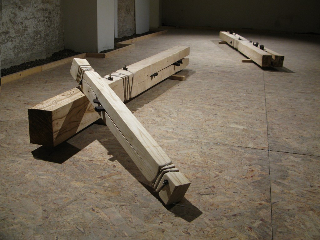 Travi di castagno, cavi d’acciaio inox, cunei di acciaio ossidati.