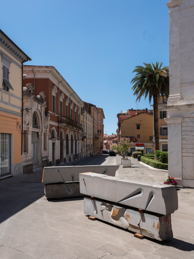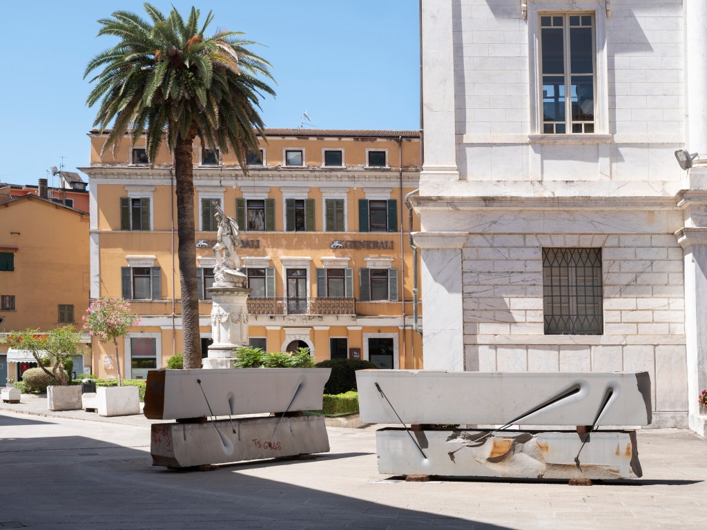 Installazione composta da tre elementi, lungo 8 m. H.20 x 330 x 25 cm, H.20 x 260 x 25 cm, H.12 x 125 x 15 cm.
