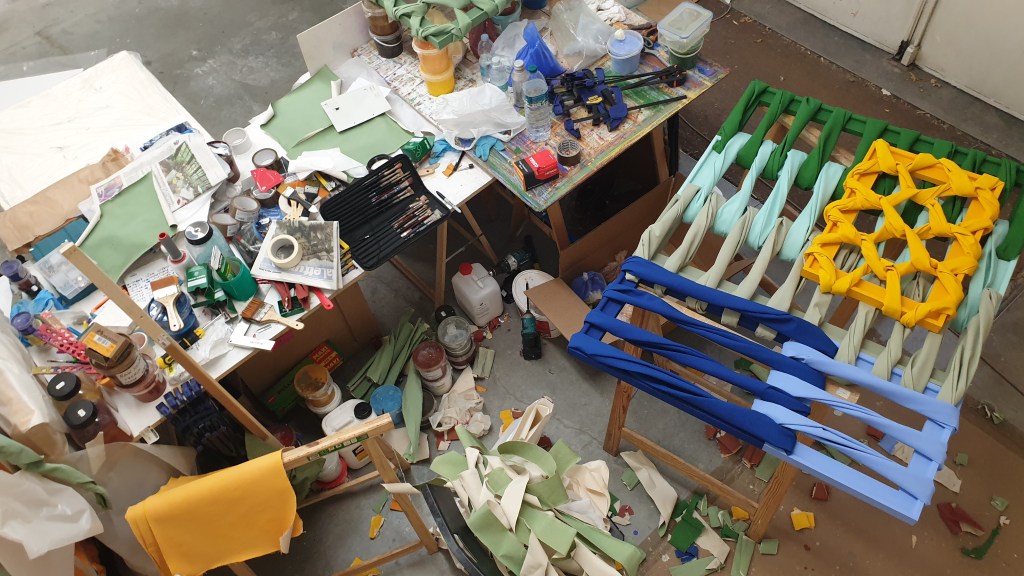 Unlike London and Rome, my experience in the studio in Milan between 2021 and 2022 fits perfectly between the two. As a Londoner, Milan for me is a city where you can easily walk because the distances seem very short. Also, as well as London, on longer journeys there is always the convenience of transport that covers almost the entire route of the city. So going to the studio in Milan for me was almost like being in London, in the sense that I walked when I could, but otherwise I could comfortably rely on public transport. In Milan, as in Rome, the studios are shared spaces and very popular with various personalities from the art world. Here too, my routine alternated between moments of production and research from home. Often the studio became a real place to meet and share with studio visits, or to relax with dinner dates.
