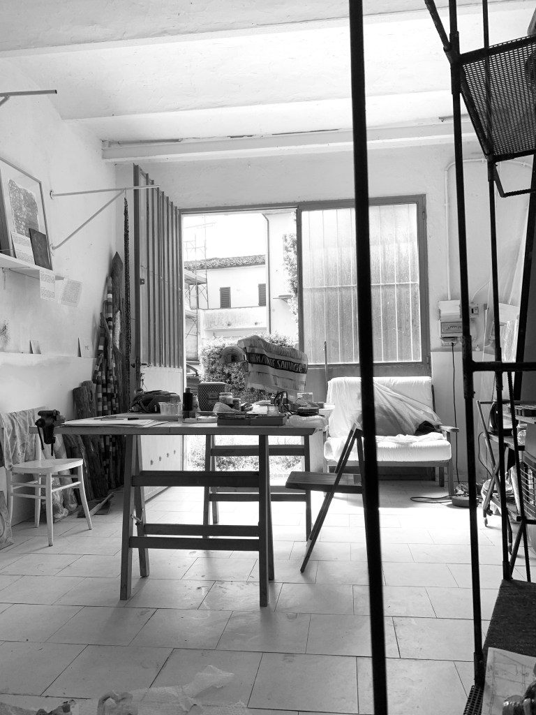 Before answering the Parola d’Artista question: what is my relationship with my studio, I did a lot of thinking because I had never asked myself the question. So I surprised myself by looking up its definition in the dictionary. Treccani says: A room or complex of rooms furnished and equipped for the performance of certain professional activities. s. artistic, s. of a painter, of a sculptor, equipped with special conditions of natural lighting (large windows in the upper parts of the walls, skylights in the ceiling). A laboratory is similar, on Wikipedia I read: A laboratory (from the Medieval Latin laboratorium, derived from laborare meaning ‘to work’) is a building or room equipped and dedicated to the study of a particular subject, not necessarily scientific.