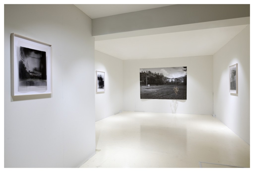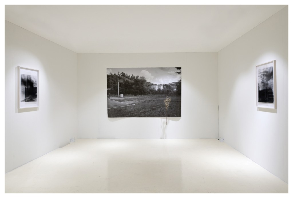 Anatomia imperfetta, 2023. Veduta parziale dell’allestimento, (A sinistra e a destra) Tutto è sospeso, fotografia su pellicola analogica cm. 60 x 80,( Al centro) Paesaggio, grande immagine con elemento naturalecm. 250 x 160. Ph Michele Alberto Sereni, Spazio Bianco Pescheria di Pesaro