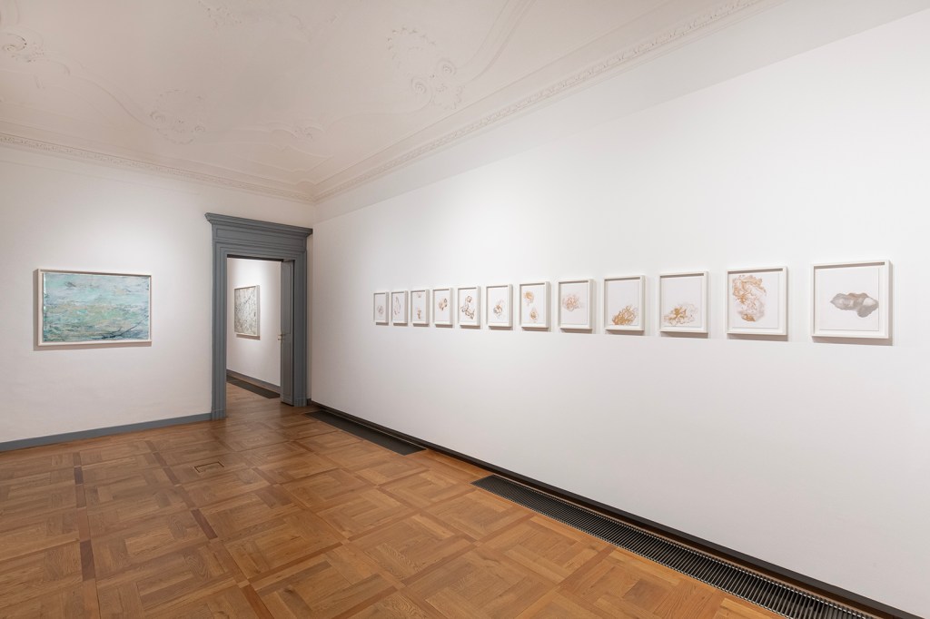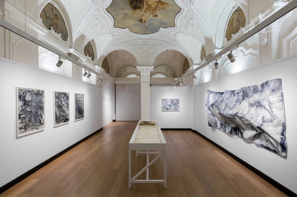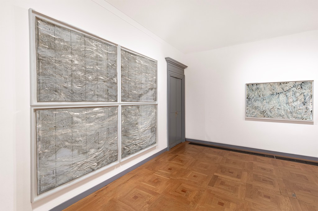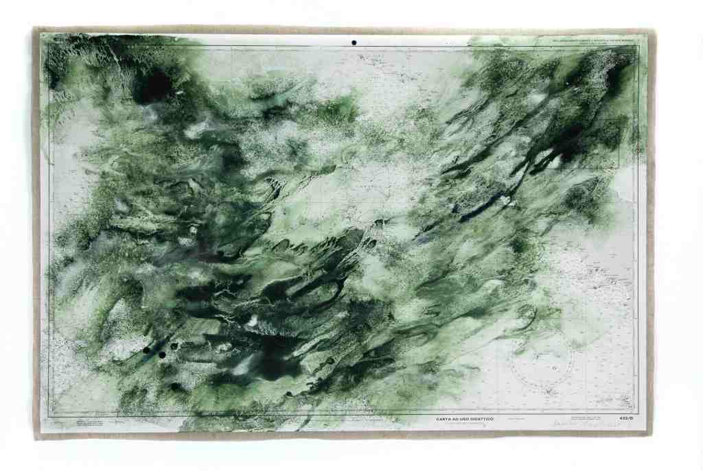 Ciò che ho sentito e percepito si è concretizzato in nuove opere che hanno iniziato a prendere forma subito dopo il mio ritorno nel mio studio di Beacon, a New York. Ho preso le mappe che mi sono state consegnate all’arrivo al Parco del Monviso e ho inondato le dettagliate informazioni cartografiche della mappa originale stampata con intricate correnti fluenti di colore naturale fatto in casa che evocano l’espressione vivace delle acque della sorgente del Po che scorrono in quel magnifico paesaggio alpino. Queste opere portano le acque in superficie, liberando il loro linguaggio su quello umano etichettato e calcolato, libero e fluente. È l’immaginazione di una nuova mappa da guidare, a cui tornare e da condividere.
