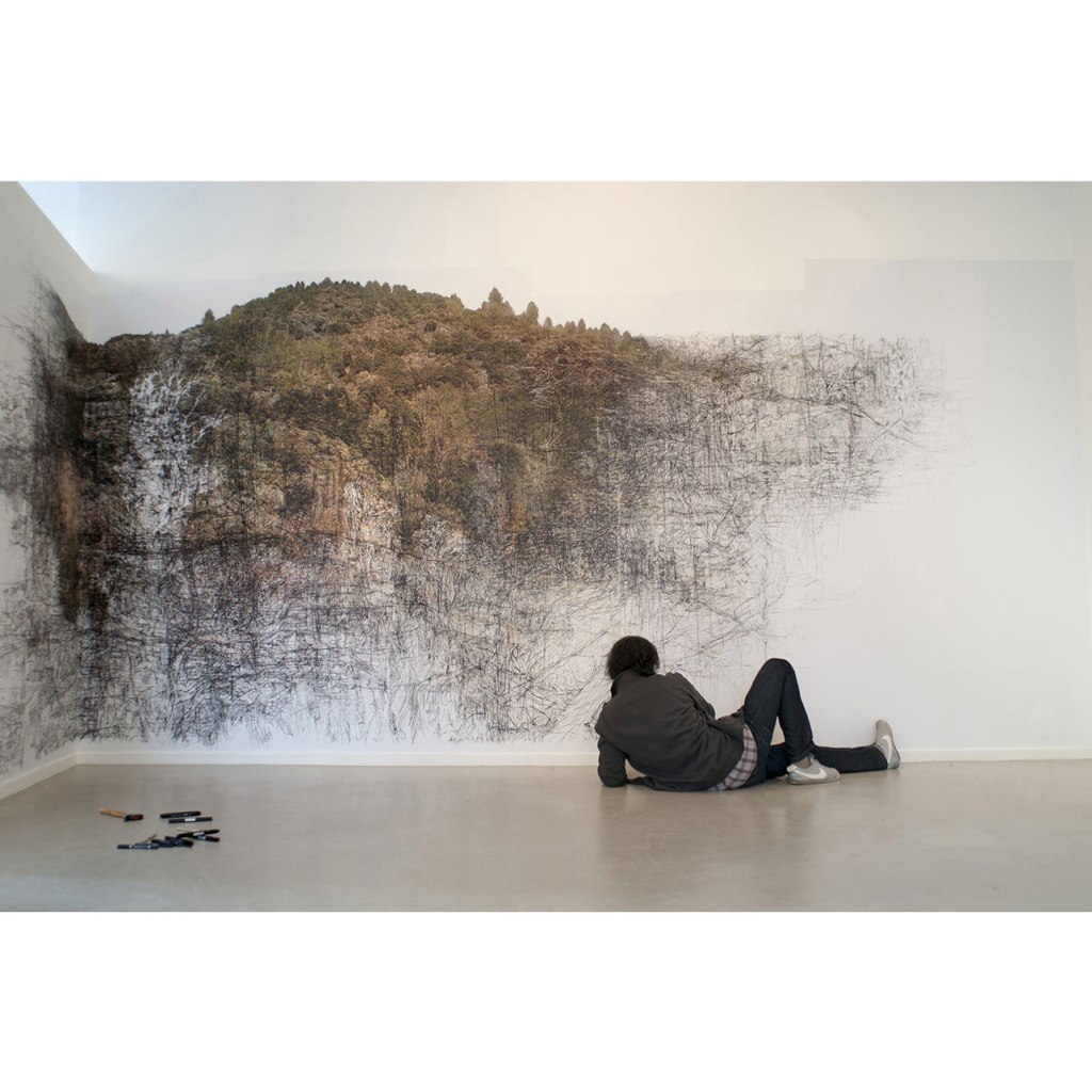 B.F.: La conséquence de cette pratique ouverte du dessin est une propension des lignes tracées à sortir du cadre rigide du plan fixe de la feuille ou du tableau pour pouvoir se déployer librement dans l’espace en 3 dimensions. A partir des années 200O, l’avènement du numérique a considérablement ouvert le champ de mes investigations: par les facilités d’hybridation des techniques de l’image et du dessin. Par un jeu intuitif entre tracer des lignes sur écran à l’aide d’une tablette graphique, crayonner sur des feuilles de papier ou sur des carnets de croquis pour les reproduire et mélanger sur encore d’autres supports graphiques, cette pratique ouverte du dessin est à la croisée de la photographie du dessin et de l’installation. Par la diversité des supports, des méthodes de