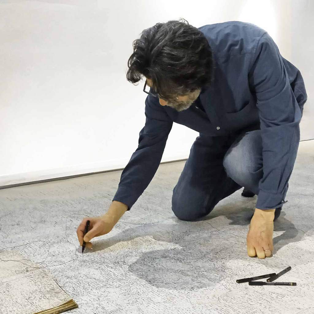 Bertrand FlachotDiplomato all’Ecole Nationale des Arts Décoratifs (1973-78), Bertrand Flachot è particolarmente interessato alla scenografia della vita quotidiana sotto la direzione di Hervé Flachot. La scenografia della vita quotidiana sotto la direzione di Hervé Fischer. Fischer. Pur avvicinandosi alla Body Art e alla performance art, ha perseverato nella sua pratica pittorica illuminato dal rapporto eminentemente fisico che Jackson Pollock ha stabilito con la pittura. In questa dinamica, immagina passo dopo passo una messa in scena della pittura. Negli anni Duemila, l’avvento della tecnologia digitale gli ha permesso di tornare ai principi originari dell’interdisciplinarità, con i principi originari di interdisciplinarità tra supporti e media, permettendogli di sviluppare un corpus di lavori che combinano disegno, fotografia e installazione, sia in gallerie, centri d’arte e musei. Oggi, questo vagabondaggio grafico, che produce una massa lineare in continua espansione, un non-finito, sta diventando sempre più simile alla scrittura. alla scrittura, facendo rivivere all’artista il desiderio di scrivere.