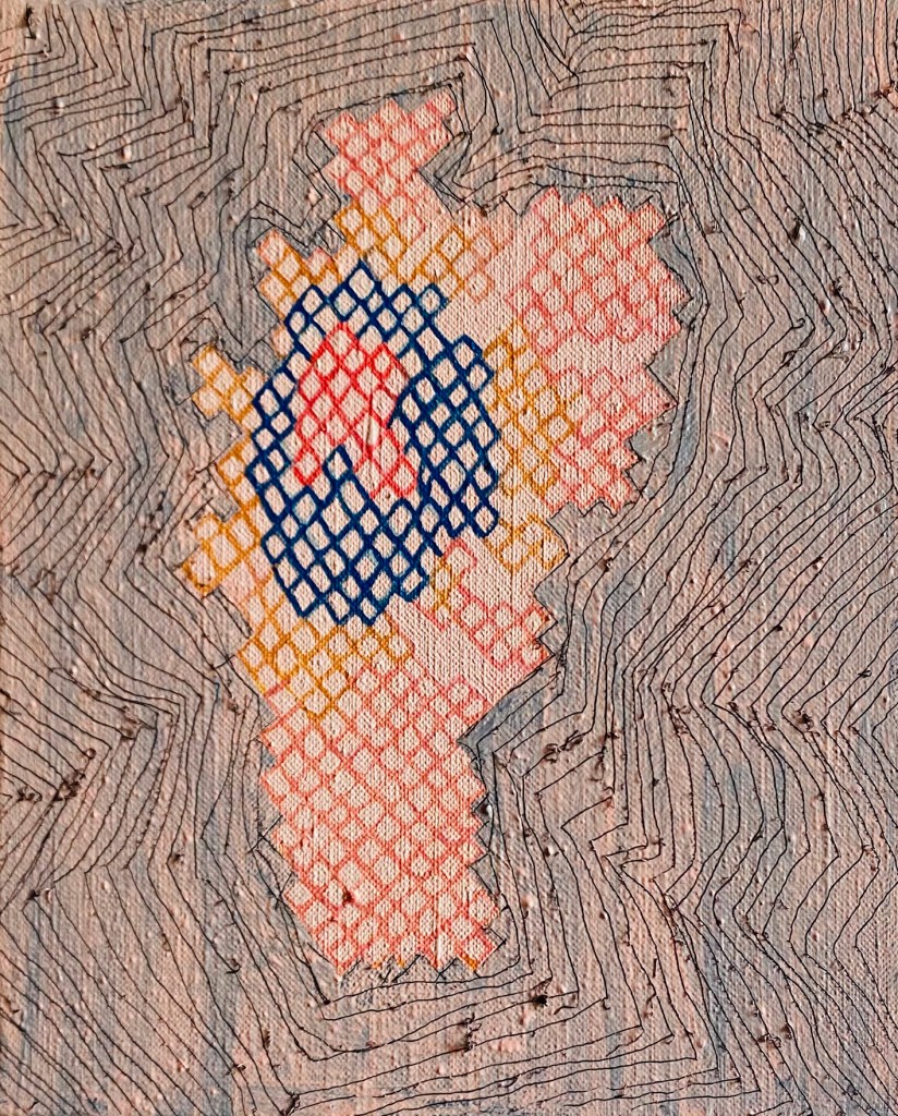 M.R.:Amo il colore, poi nel 2020, con Covid e altri eventi è sopraggiunto il nero accompagnato da una sensazione di costrizione e di prigionia che mi porto ancora dentro. Ora le maglie si stanno allentando e anche il colore riaffiora, un colore che ha subito delle variazioni.
