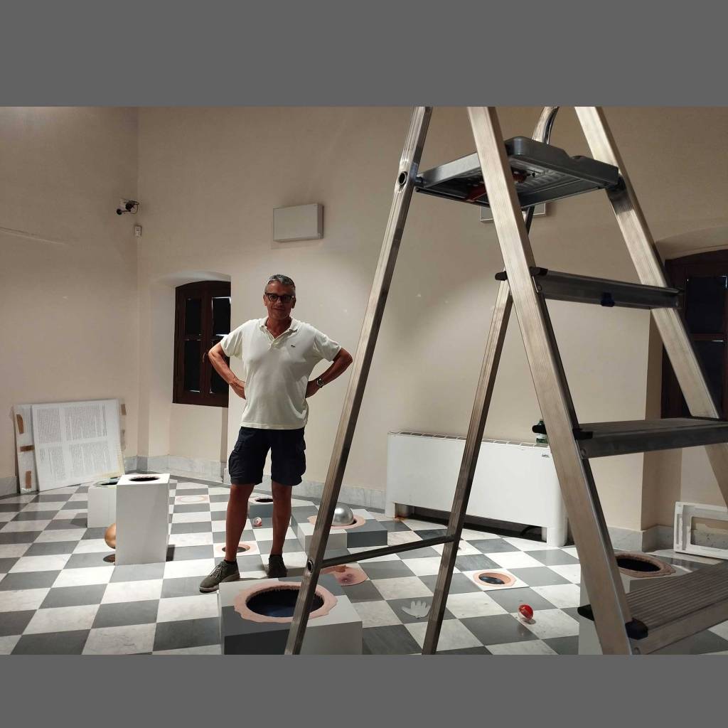 G.S. The mudaC is the museum of contemporary art in Carrara. If in Milan I was enchanted by the perspective and mock oculi of S. Satiro and the Portinari Chapel, here I would never tire of looking at the former Balilla Tower or also known as the Fiat Tower, with its helical internal well, in the Partaccia area. Not only the great works of the past are a source of inspiration. A kind of initiation occurred by looking into the hole of the fountain in the Piazzetta del Forte in Forte dei Marmi. Through the pipe, water came out of the darkness and depths; an echo sprinkled with little letters and little numbers was already in the air … The artistic coincidences, the working environment and the opportunities that this city has given me contributed to the realization of this work. For me, Carrara is the city of light and white but it is also the city of darkness and abyss when I think of the Apuan Alps, caves, ravines… If at certain times of the day the city center is shrouded in a suspended and dazzling light, the night landscape is even darker and more ghostly, with the mountains rising above the houses. This stark, dual contrast, is found in the checkerboard floor of the Project room; and this is where my work comes from. If in Tellaro the holes in the floor resembled trapdoors or hatches, here they recall cavities, solid forms, extractions … perforations.