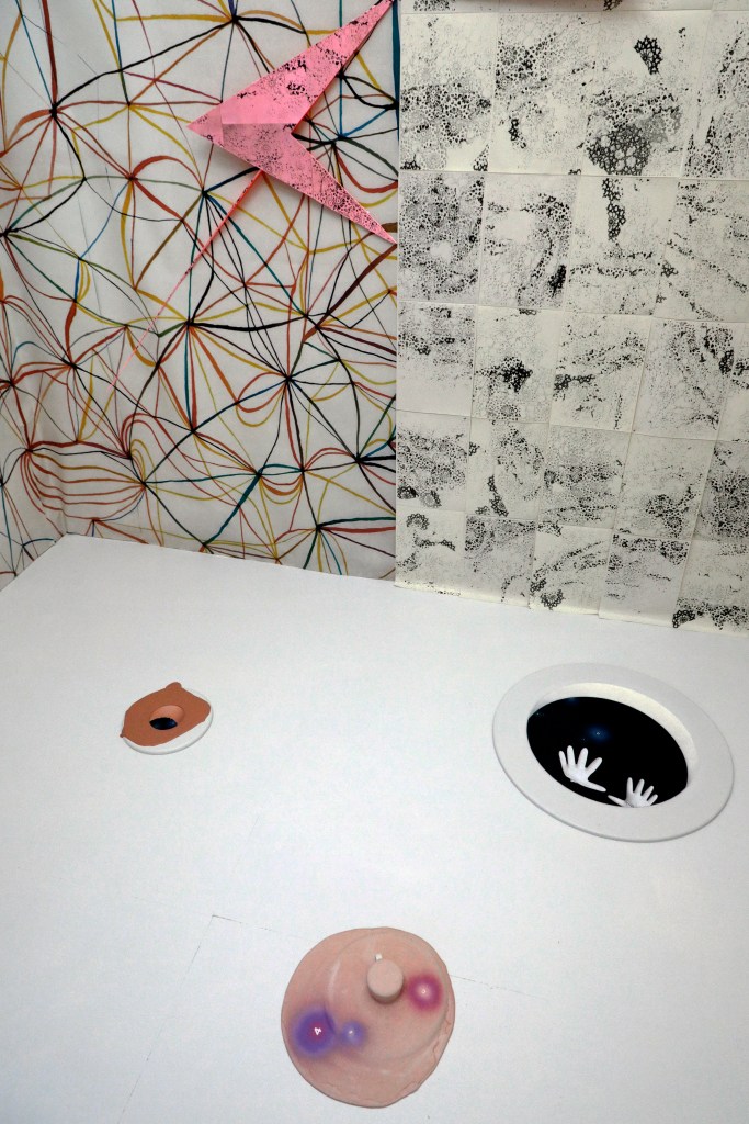 Le coincidenze artistiche, l’ambiente di lavoro e le opportunità che questa città mi ha dato hanno contribuito alla realizzazione di quest’opera. Per me Carrara è la città della luce, del bianco e della luce ma è anche la città dell’oscurità e dell’abisso quando penso alle Apuane, alle grotte, agli anfratti… Se in certi momenti della giornata il centro città è avvolto da una luce sospesa e abbagliante, il paesaggio notturno è ancora più buio e spettrale, con le montagne che si ergono sopra le case. Questo netto e duplice contrasto, si ritrova nel pavimento a scacchiera della Project room; ed è da qui che nasce il mio lavoro. Se a Tellaro i buchi nel pavimento assomigliavano a botole o portelli, qui richiamano cavità, forme solide, estrazioni … perforazioni.