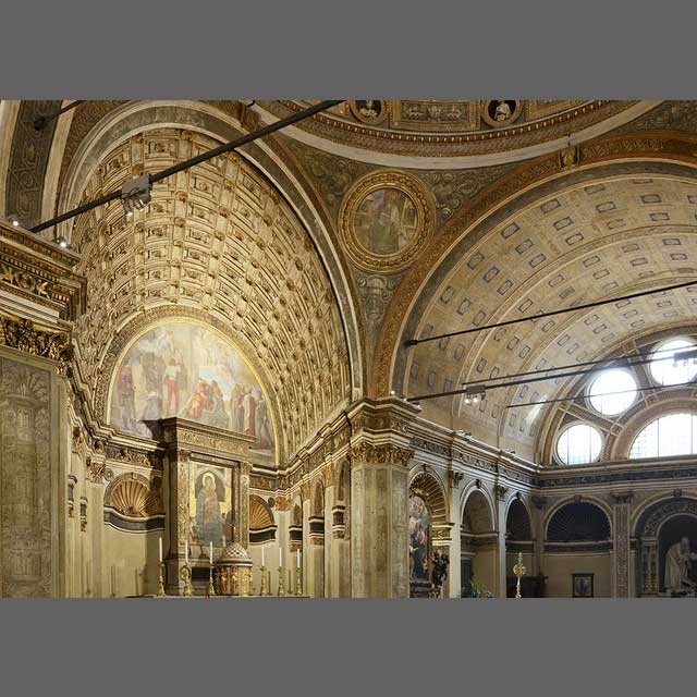 G.S. Renaissance churches and chapels are full of circular decorative elements: closed, open, dark or luminous circles … But in the specific case I was inspired by the illusionistic architecture in Bramante’s transept in the church of Santa Maria presso San Satiro in Milan.